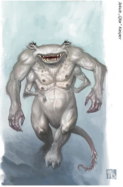 Gdy znajdziemy się już u stóp Pakkoramu, w krainie pokrytej śniegiem przez 8 z 9 miesięcy roku, przyjdzie nam stawić czoła nie tylko surowej pogodzie, kłopotom z prowiantem i pokonywaniem drogi. Ziemie te są ojczyzną Nayannów i Ekkydorów. Nazwy brzmią obco i złowrogo w uszach Pyarronczyka, lecz niech nie zwodzi nas ludowe opisanie świata mego rozmówcy. Mamy tu zapewne do czynienia z potworami lodowych krain, wzmiankowanymi w cytowanej już „Spuściźnie wieków chaosu” Viselina con Fyalas. Nayann to Lodowy Demon wedle indeksu mistrza Viselina. Istota niezmiernie rzadka i cenna dla każdego badacza starożytnych form chaosu. Z demonami co prawda nie ma nic wspólnego, gdyż przyrodoznawcy zaliczają ten byt do gromady ssaków. Ja będę się dalej posługiwał nazewnictwem Subotaia, a po powrocie zawnioskuję do profesorów Akademii Magicznej w Lar Dor, by zmienić miano Lodowego Demona na starogodońskie Nayann Subotaium Grimbanusae. Nayann jest dużym i silnym drapieżnikiem, mistrzowsko urobionym przez naturę do życia w mroźnym klimacie. Jego ciało pokrywa śnieżnobiałe, gęste i krótkie włosie. Myśliwy powiadał, że słyszał opowieści o 10 stopowych okazach tego potwora, ale sam widział o 2-3 stopy niższe stworzenia. Łeb Nayanna jest duży i płaski, osadzony na krótkiej acz ruchliwej szyi, mogącej ponoć obrócić się prawie wokół własnej osi. I nie chodzi tu wedle mego mniemania o polepszenie pola widzenia tego drapieżnika. Jego oczy osadzone są na dwóch giętkich i dość długich wypustkach. Natomiast paszczęka, wypełniona czterema rzędami ostrych jak predockie miecze zębów, potrafi się rozewrzeć na imponującą szerokość.